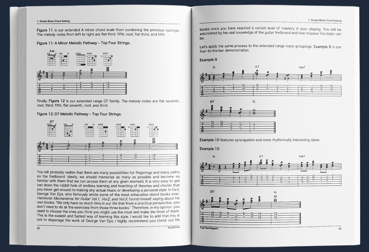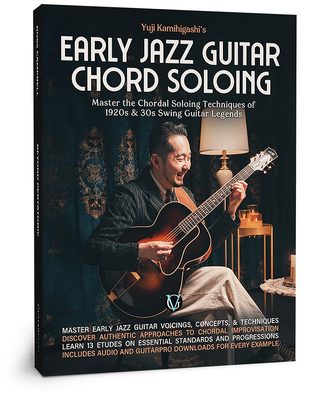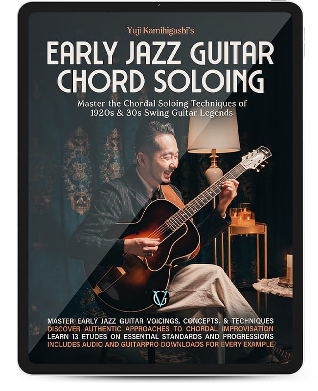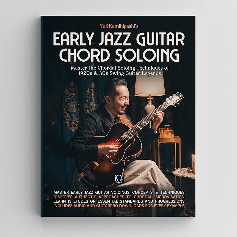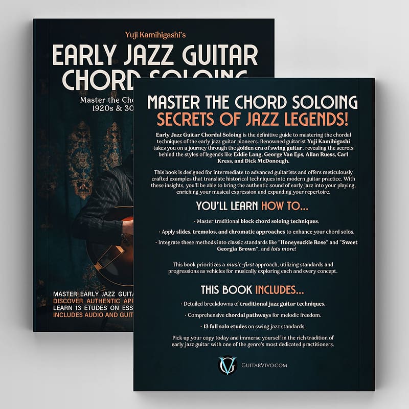 Early Jazz Guitar Chord Soloing is the definitive guide to mastering the chordal techniques of the early jazz guitar pioneers. Renowned guitarist Yuji Kamihigashi takes you on a journey through the golden era of swing guitar, revealing the secrets behind the styles of legends like Eddie Lang, George Van Eps, Allan Ruess, Carl Kress, and Dick McDonough.