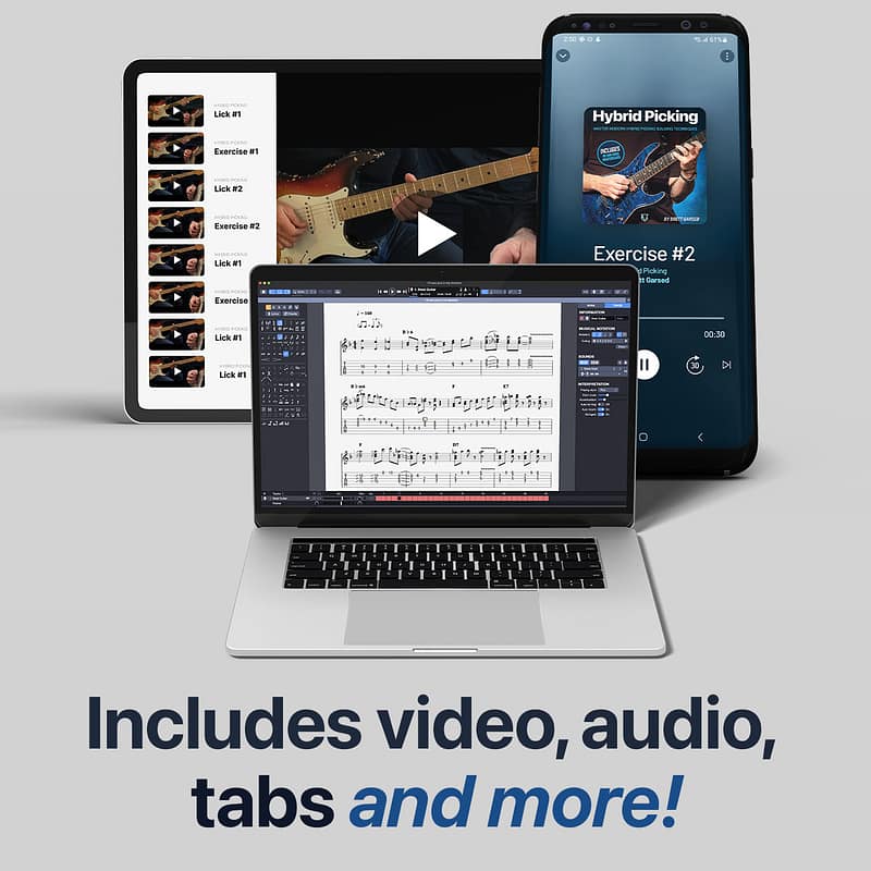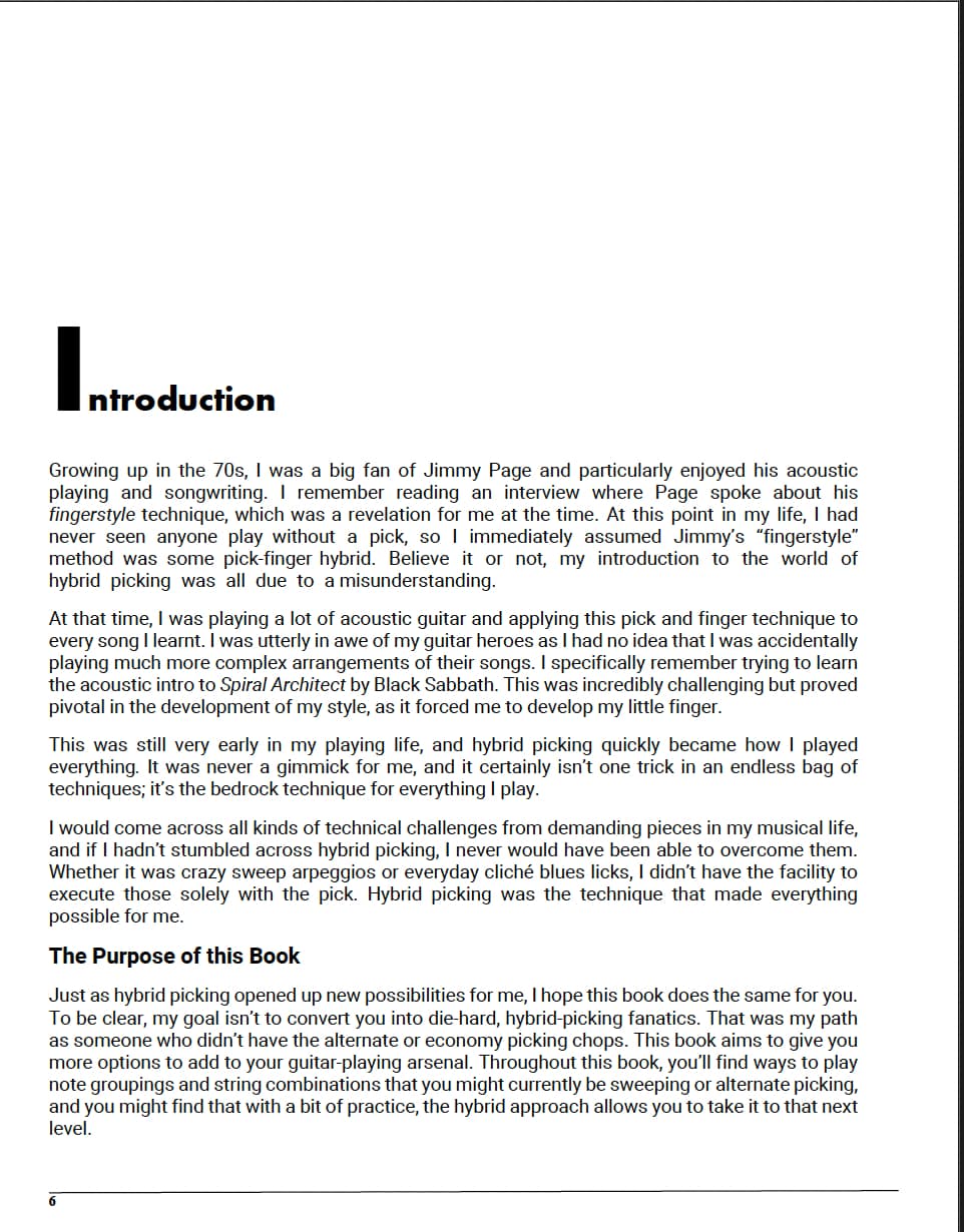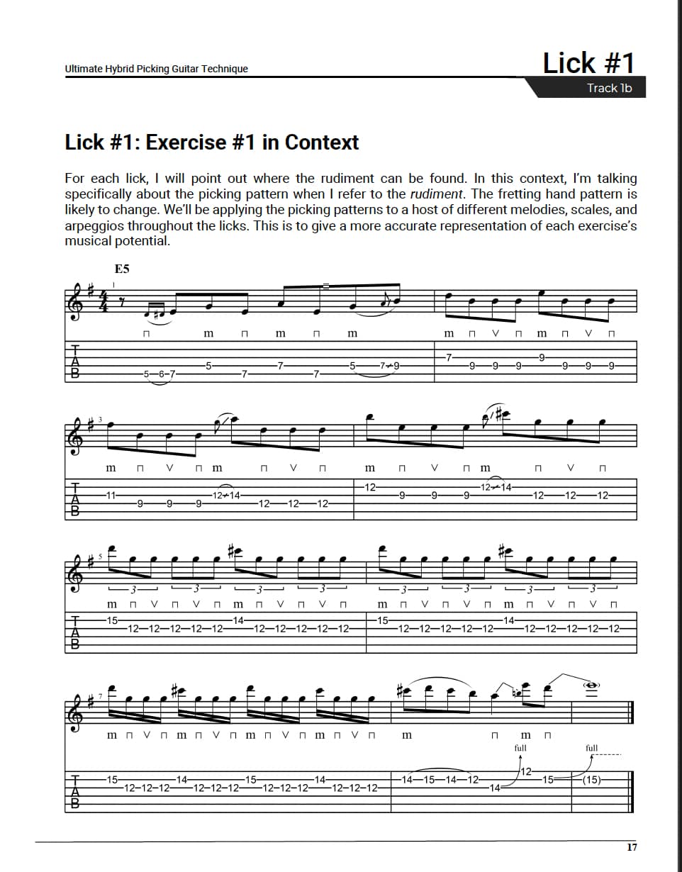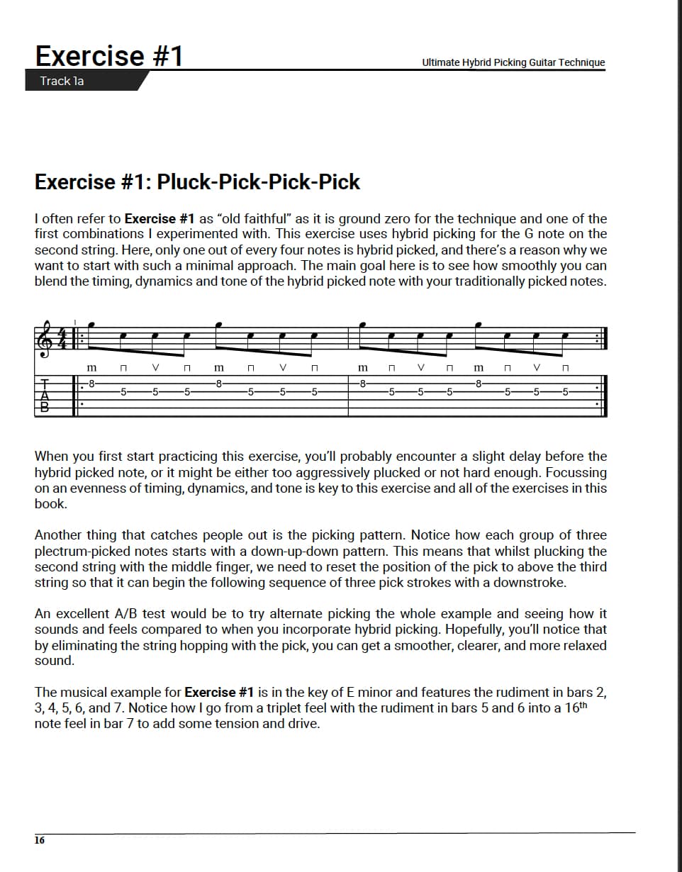 In a unique approach, you’ll be guided through 50 carefully crafted hybrid picking rudiments, each with their own accompanying lick or solo so you can see the technique in musical action.