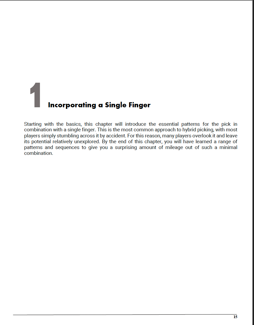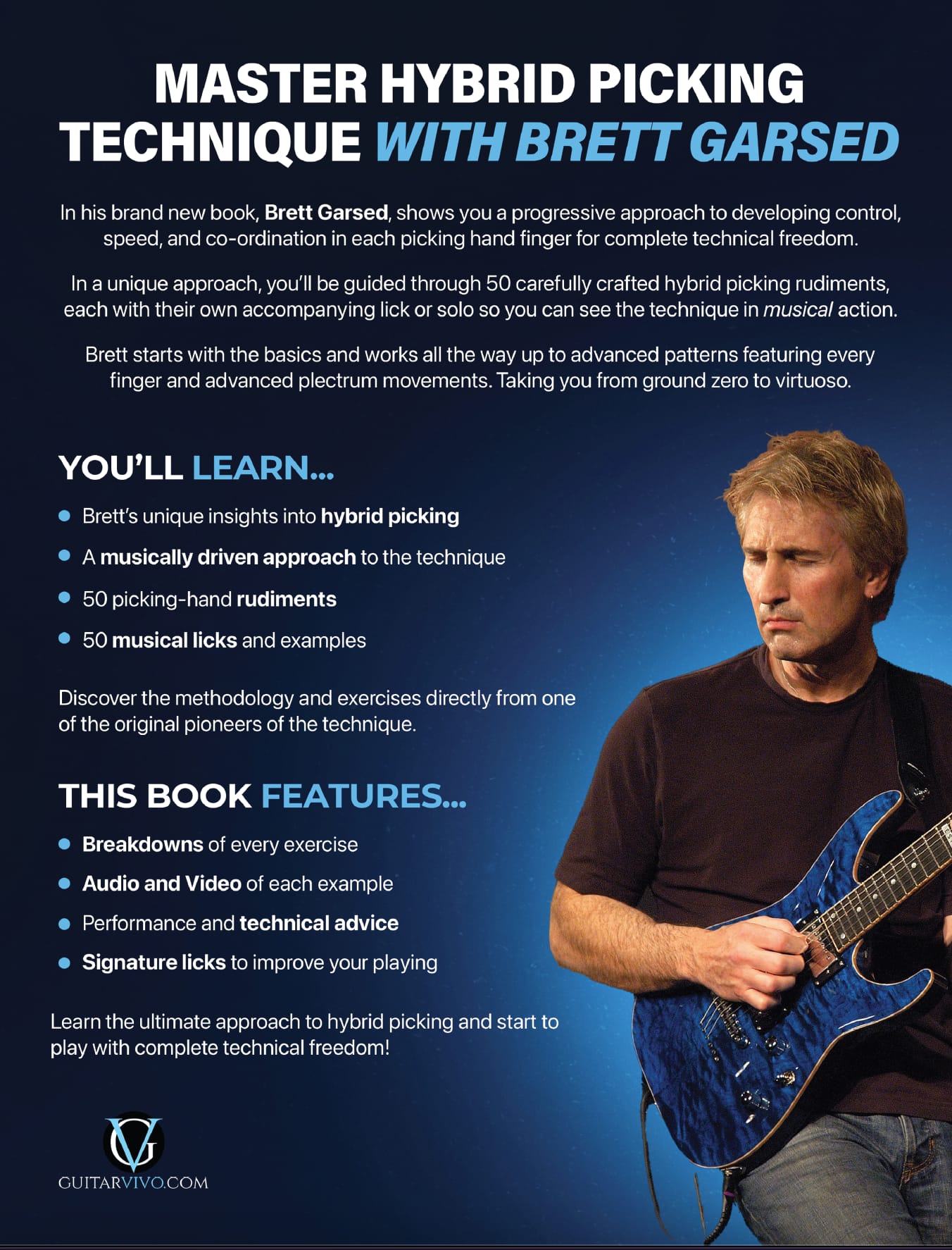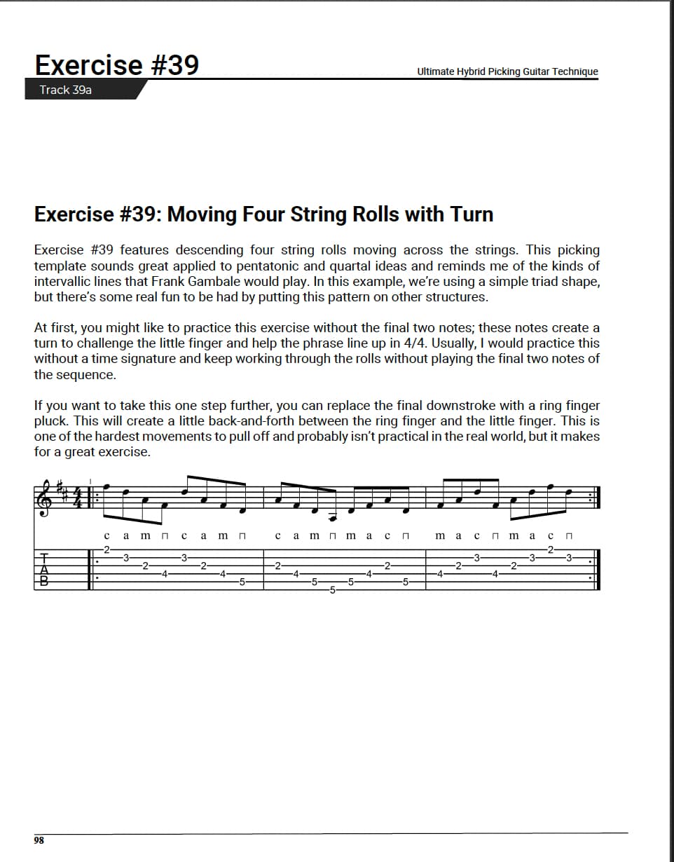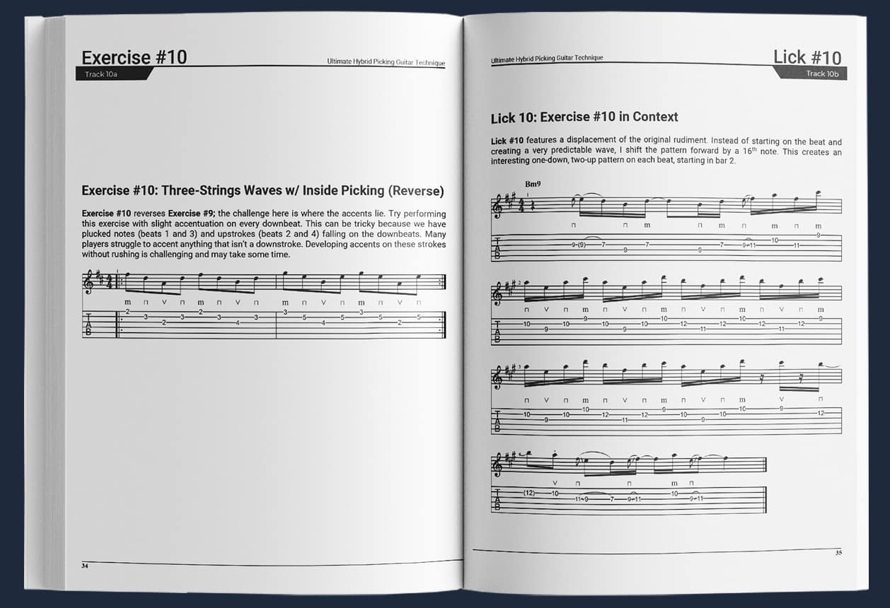 In a unique approach, you’ll be guided through 50 carefully crafted hybrid picking rudiments, each with their own accompanying lick or solo so you can see the technique in musical action.