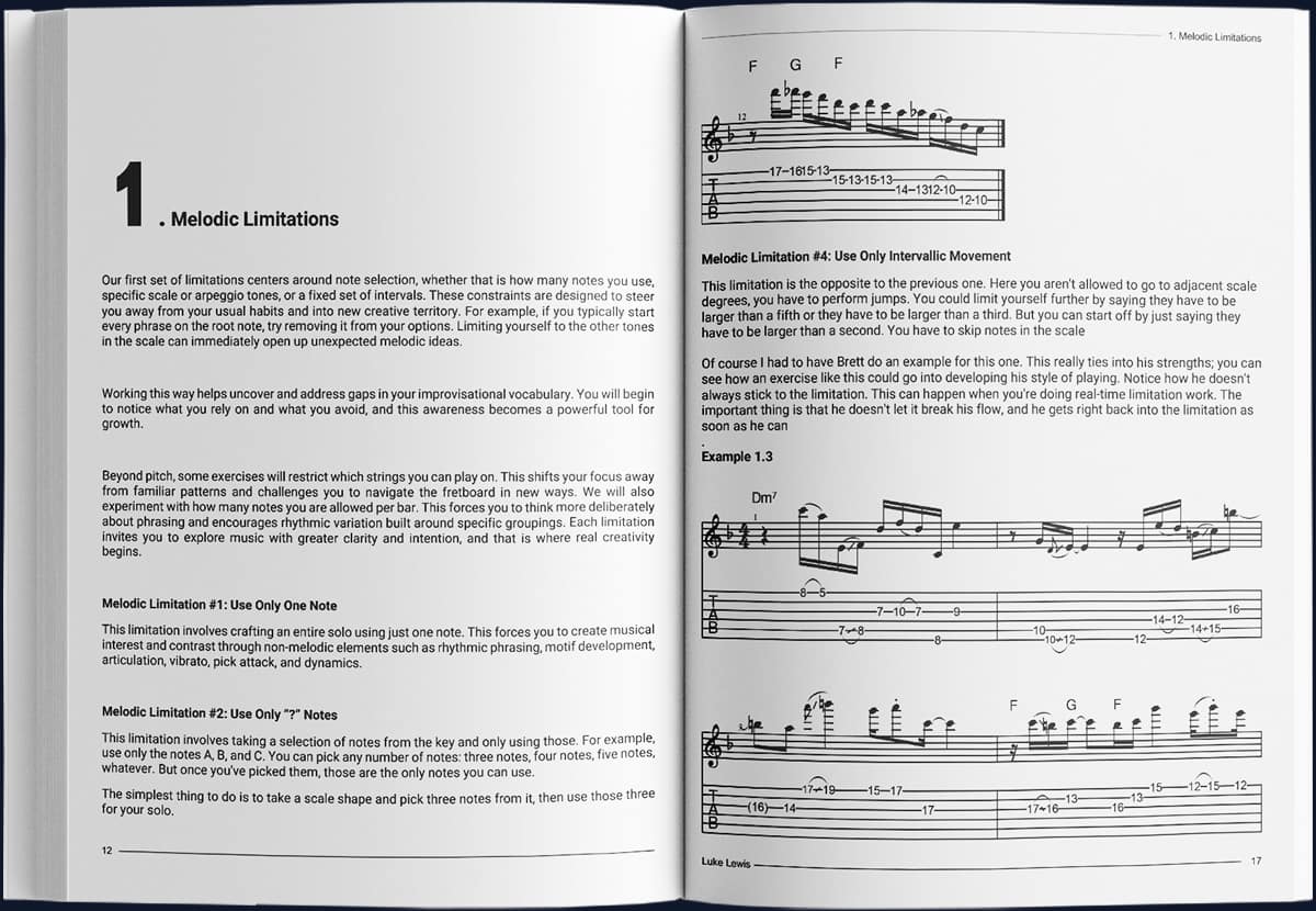 This chapter isolates the physical side of your playing. You'll explore limitations involving picking direction, articulation, dynamics, accents, finger usage, and attack. Rather than mindless drills, these exercises build control, consistency, and expressive nuance. By focusing on how notes are produced, you'll develop greater sensitivity, cleaner execution, and a deeper connection between technique and musical intent.