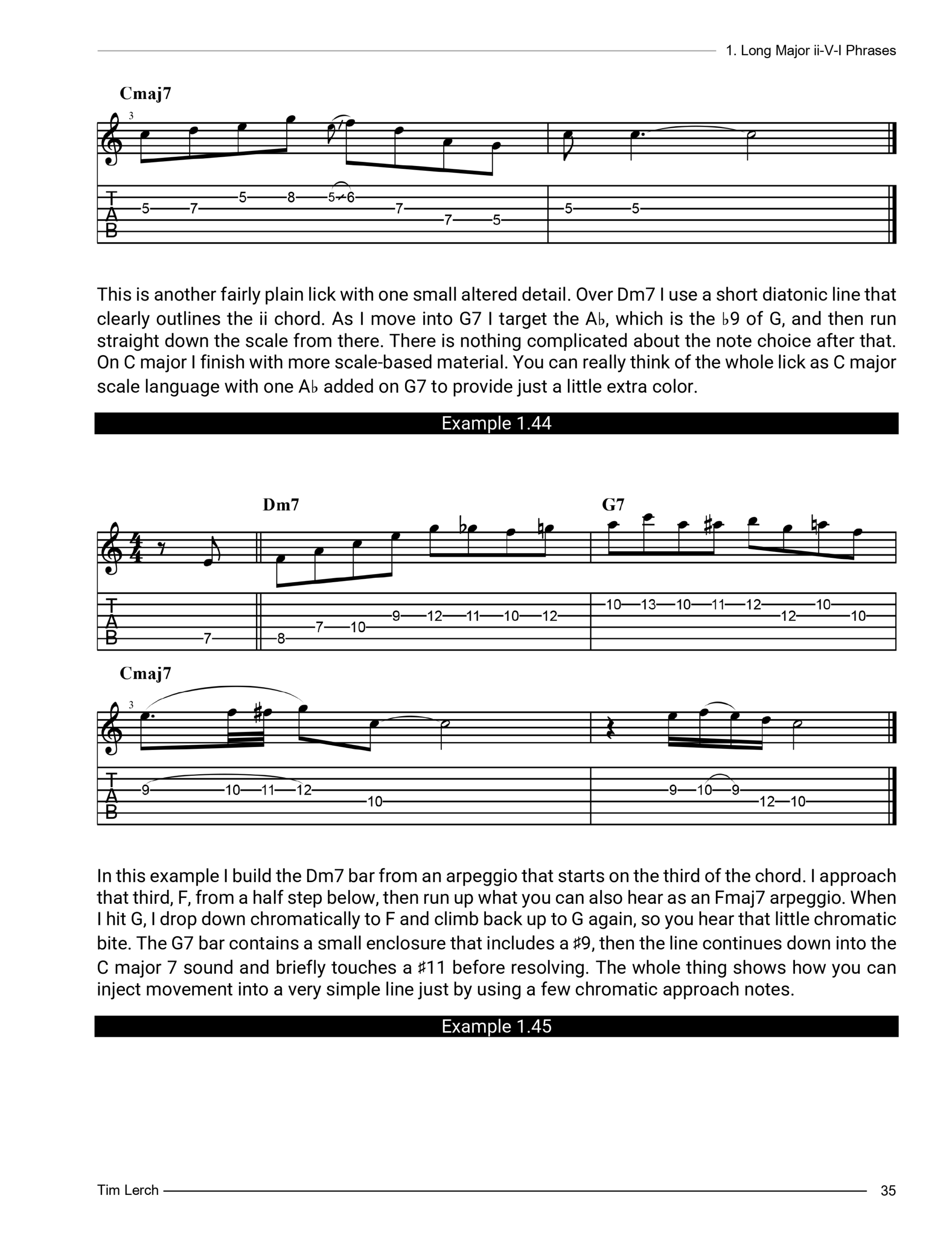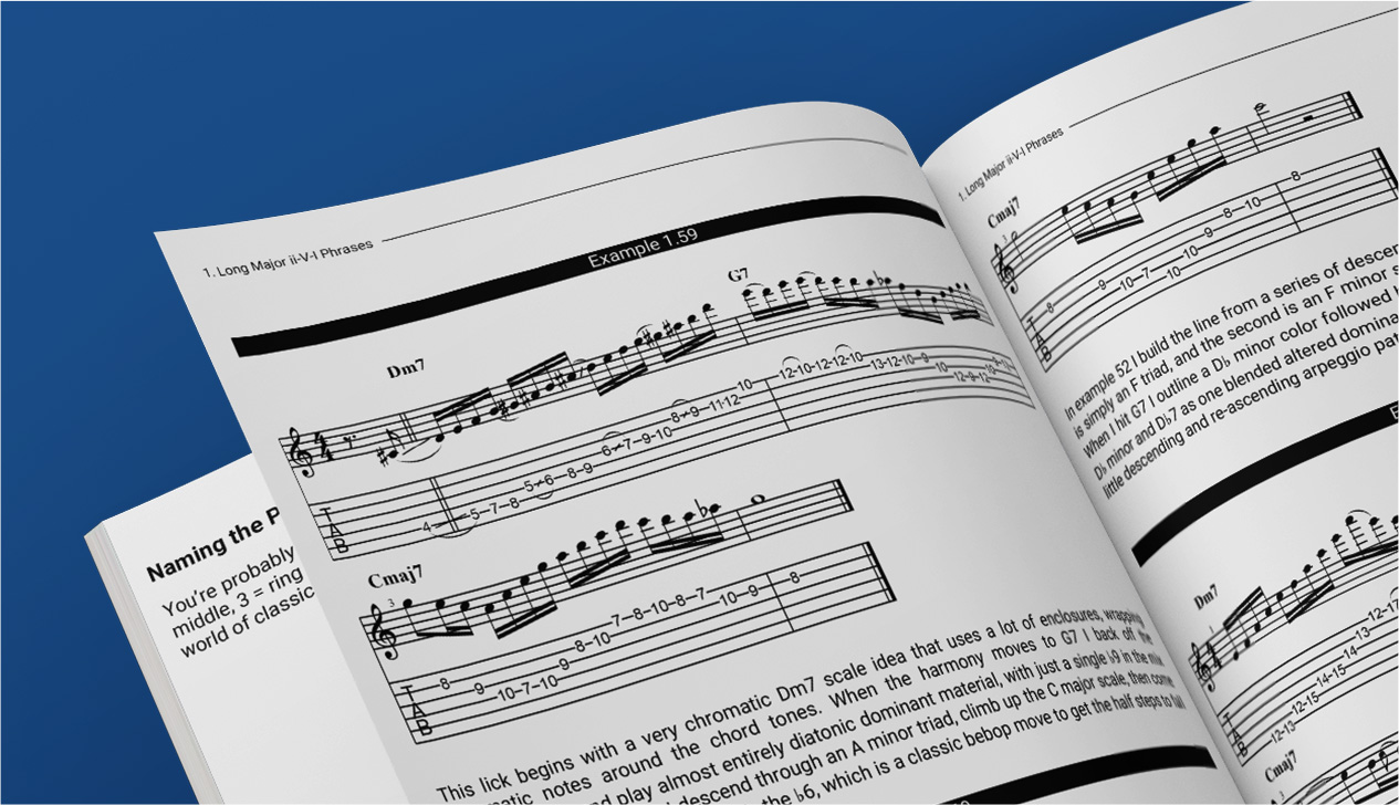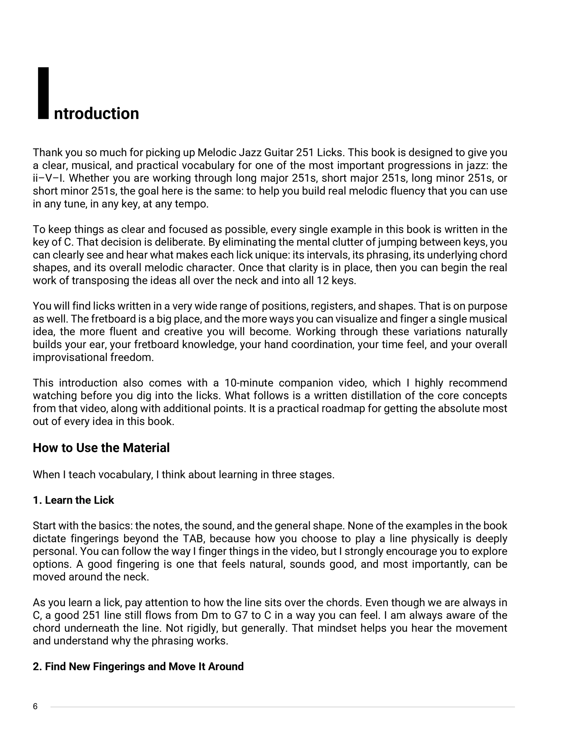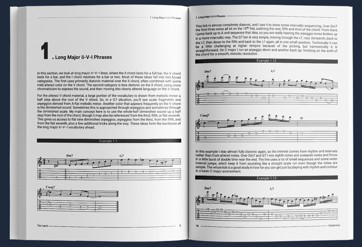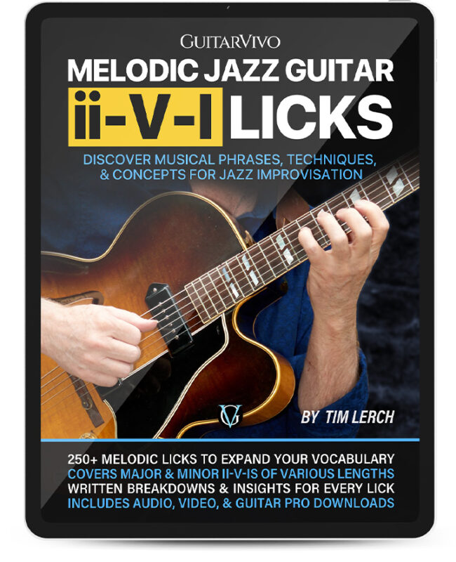 This introduction lays out the philosophy behind the book and how to get the most from the material. You’ll learn why all examples are presented in a single key, how to think melodically rather than mechanically, and how to practice vocabulary in a way that leads to real improvisational freedom. Tim explains how ii–V–I fluency comes from understanding sound, shape, and movement across the fretboard—not from memorizing isolated licks.