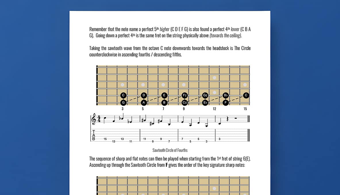 You'll discover that the exact order of sharps (F-C-G-D-A-E-B) and flats (B-E-A-D-G-C-F) is already encoded inside the Circle — you just need to know where to look. You'll master a quick, reliable method to work out any key signature on the fly without memorizing lists. You'll also learn the "Sawtooth Circle" pattern and how to physically navigate these note sequences up and down the guitar neck. After this, you'll be able to recall any key signature in seconds.
